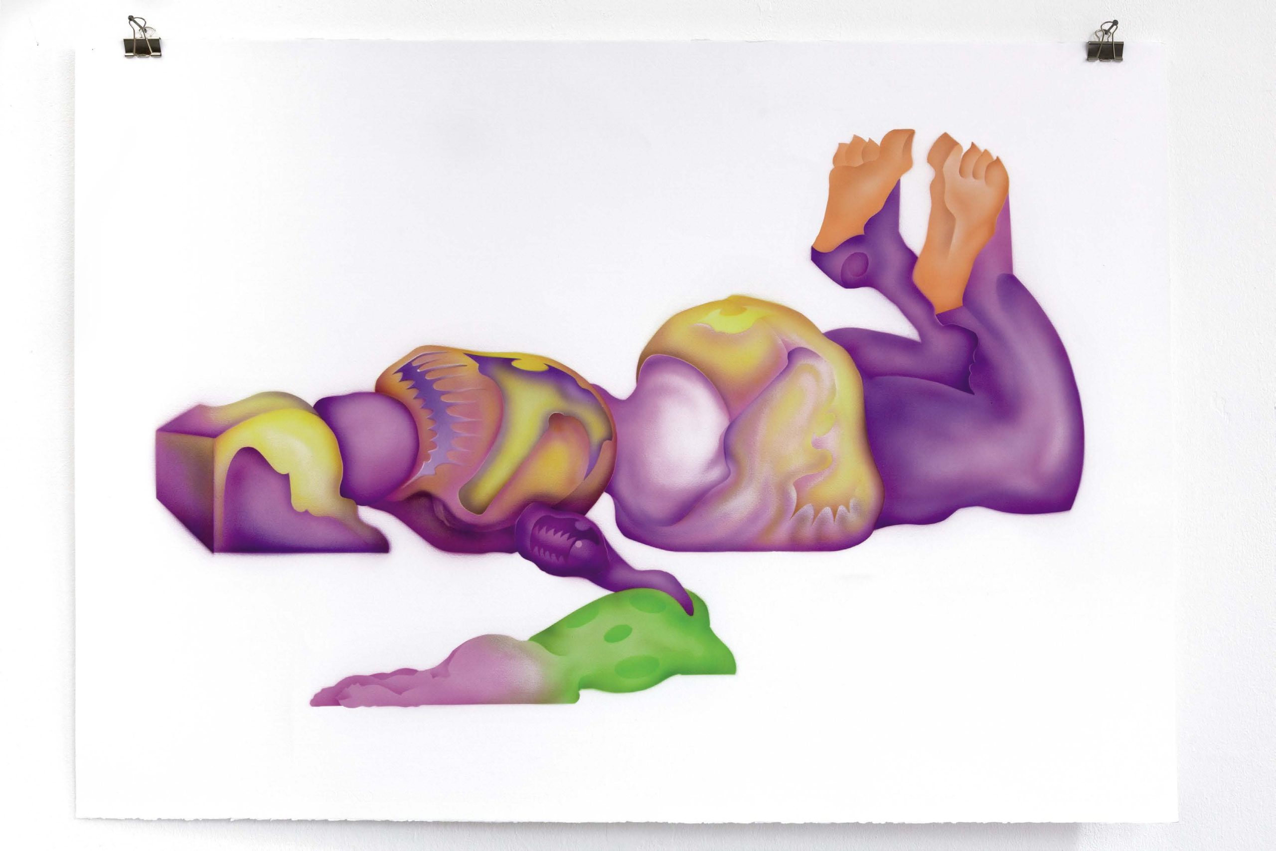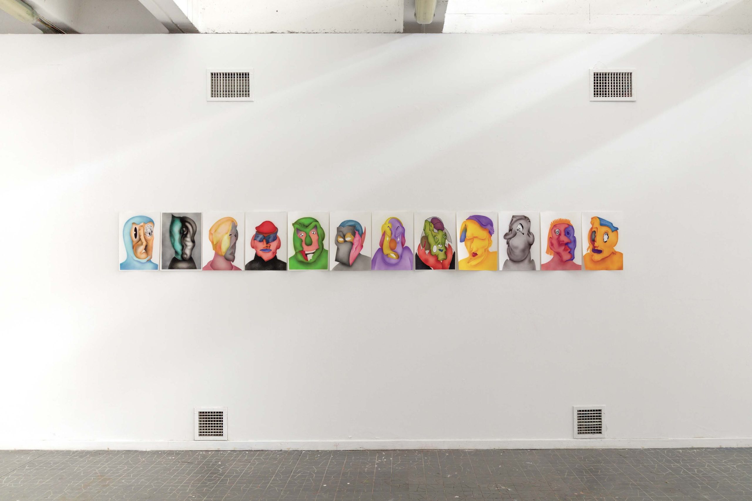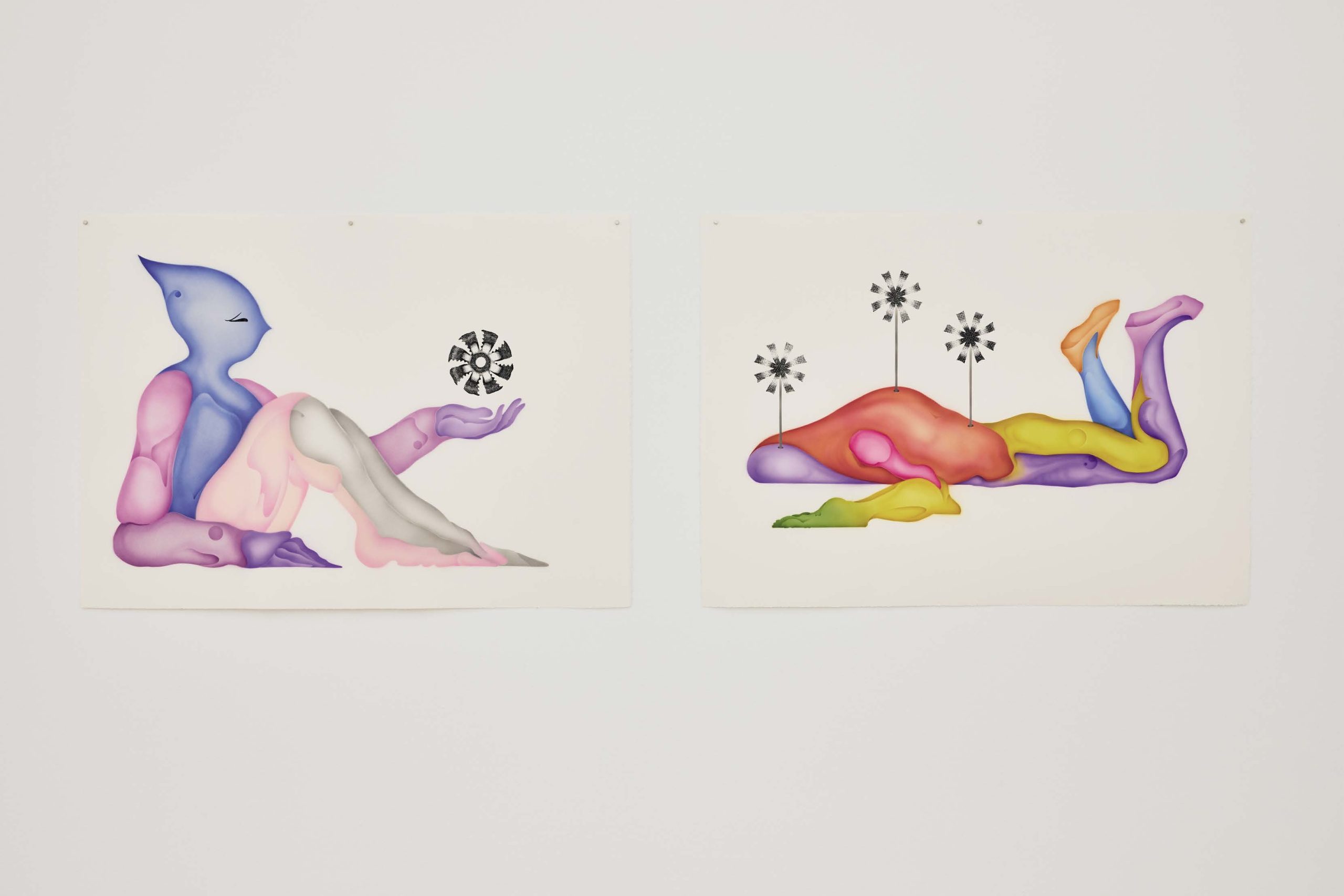 Sébastien invents hybrid characters composed of organic shapes, which certain features come from comic books and animation. These arrangements of shapes give life to surreal corporealities revealing anthropomorphic landscapes. In his recent works, he connects gear-shaped objects, evoking the biomimetic principles, with inert figures where time seems suspended. His images are like portals to a changing and unstable ecology where organic and technological matter mix and interact. Paintings can evoke the hostile effects of our carelessness towards our environment while avoiding adopting a moralistic tone. The idea would be to suggest the possibilities of ecological recovery or, more innocently, the capacity of nature to adapt positively.